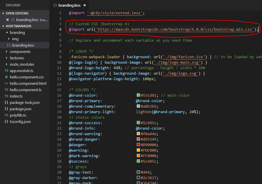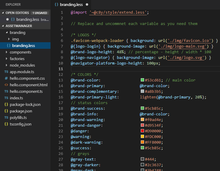 Das Branding kann kann innerhalb der Datei ‘branding.less’ erstellt werden: