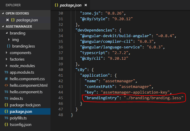 Nach der Erstellung des custom brandings muss das Branding innerhalb der ‘package.json’ bekanntgemacht werden.
