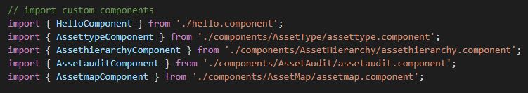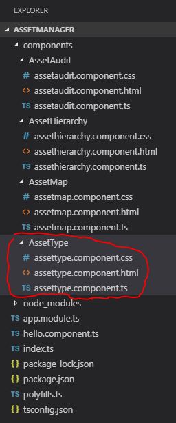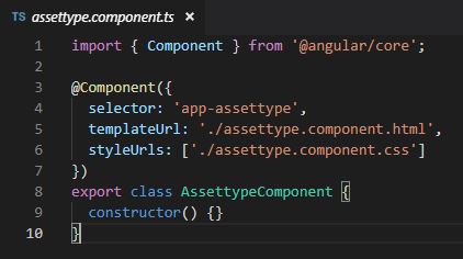 Ich beschreibe die Erstellung der Seite ‘Asset Type’. Die weiteren Seiten können nach dem gleichen Muster erstellt werden. Alle Komponenten werden innerhalb des Ordners ‘components’ angelegt. Eine Komponente z.B, assettype.component.ts beinhaltet eine eigene HTML & CSS Datei: