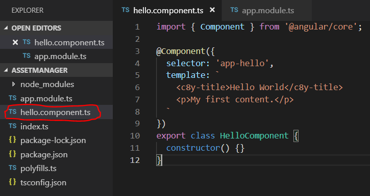 Als erstes wird die Klasse ‘HelloComponent’ (hello.component.ts) sichtbar bzw. bekannt gemacht gemacht: