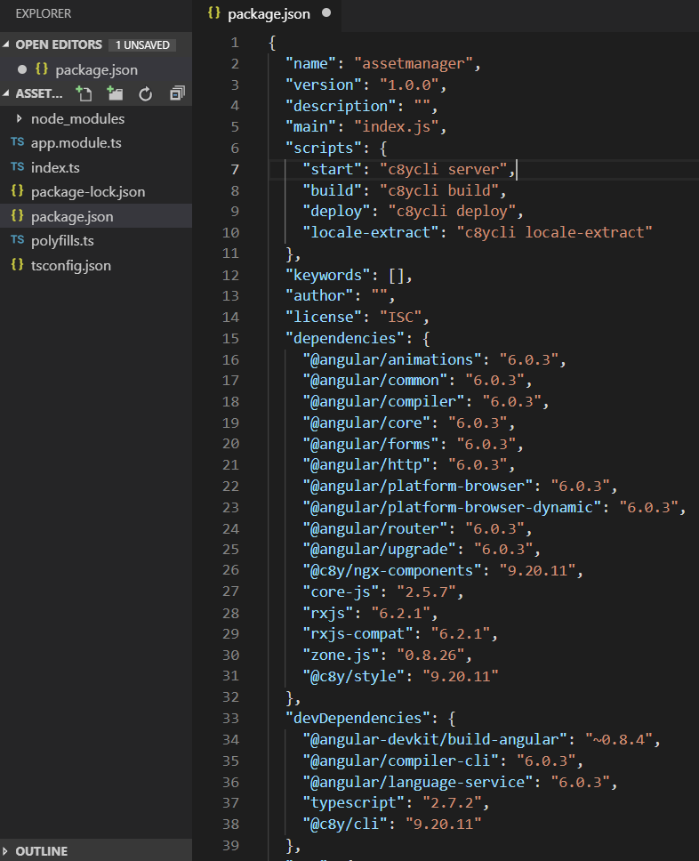 Durch die Erstellung des Projektes anhand der C8Y CLI wurde unter anderem die ‘packages.json’ Datei generiert, der die benötigten Abhängigkeiten beinhaltet.