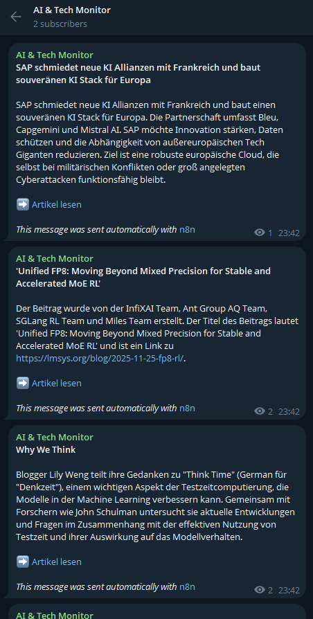 Das Ergebnis dieses Systems ist für jeden zugänglich. Es handelt sich um einen offenen Telegram-Kanal (AI & Tech Monitor), der unter der folgenden Adresse aufgerufen werden kann: