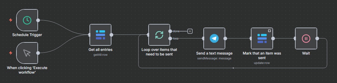 Workflow 03 - Telegram Message: Der dritte Workflow übernimmt die Veröffentlichung der aufbereiteten Inhalte. Er durchsucht die Baserow-Datenbank gezielt nach Einträgen, die zwar fertig verarbeitet, aber noch nicht als “versendet” markiert sind. Für jeden dieser offenen Posten sendet der Workflow eine formatierte Nachricht mit Titel, der AI-Zusammenfassung und dem Link an einen definierten Telegram-Kanal. Unmittelbar nach dem Versand aktualisiert er den Status des Eintrags in der Datenbank auf “gesendet” (True), um sicherzustellen, dass keine Nachricht doppelt veröffentlicht wird.