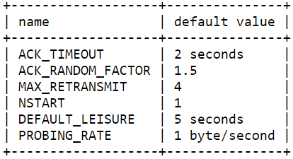 Bei der Veränderung der Konfiguration ist zu beachten, dass z.B. eine Verringerung von ‘ACK_TIMEOUT’ auf eine Sekunde gegen ‘Unicast UDP Usage Guidelines for Application Designers’ versossen wird. Weitere Veränderungen können dabei gegen andere Guidelines verstoßen. Weiterhin haben Veränderungen der obigen Parameter in bestimmten Kombinationen bzw. Konstellationen weitere Einflüsse auf die Übertragung. Für die Gewährleistung einer sicheren Kommunikation kommt ‘Datagram Transport Layer Security (DTSL)’ zum Einsatz.