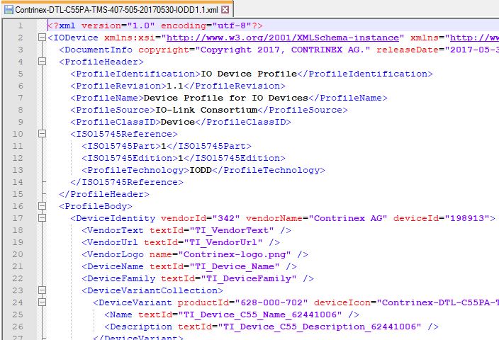 Das obige und die nachfolgenden Code-Beispiele beziehen sich auf den DTL-C55PA-TMS-407-505 Sensor der Firma Contrinex. IODD Download Link.