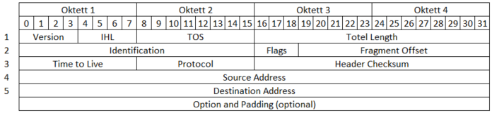 - IHL (Internet Header Length): Länge des Headers in 32 Bit Schritten. Wert 5 = 5 Zeilenx32bit