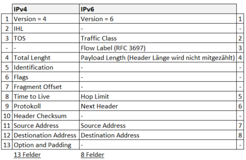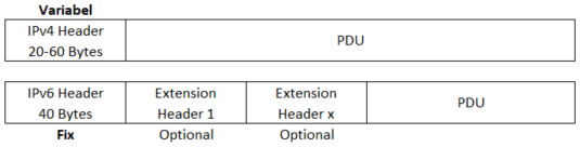 Der IPv4 Header kann zwischen 20-60 Bytes groß sein. Bei IPv6 hat der Header eine feste Größe und kann durch ‘Extension Header’ erweitert werden: