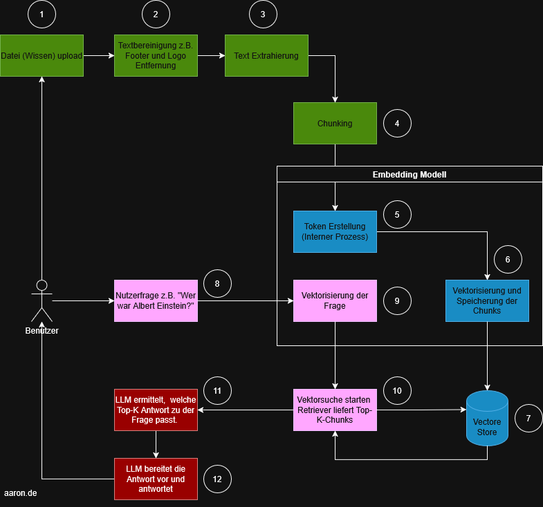 (9) Vektorisierung der Frage: Die Nutzerfrage wird in denselben semantischen Raum übersetzt wie die Chunks. Erst dadurch kann das System ähnliche Inhalte identifizieren.