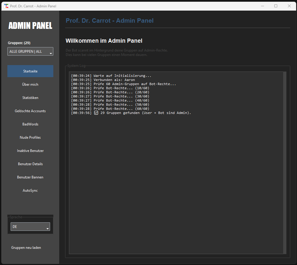 Hierbei werden vollautomatisch alle Gruppen identifiziert und gefiltert in denen der Nutzer selbst Administrator oder Hidden Admin ist und in denen sich gleichzeitig der Bot mit entsprechenden Rechten befindet. Da nicht jede Gruppe in der man selbst Admin ist zwangsläufig auch den Bot beinhaltet fallen einige Gruppen durch das Raster. Am Ende dieser Überprüfung wurden im vorliegenden Fall exakt 29 Gruppen validiert die anschließend für die zentrale Administration und alle weiteren Automatisierungen zur Verfügung stehen.