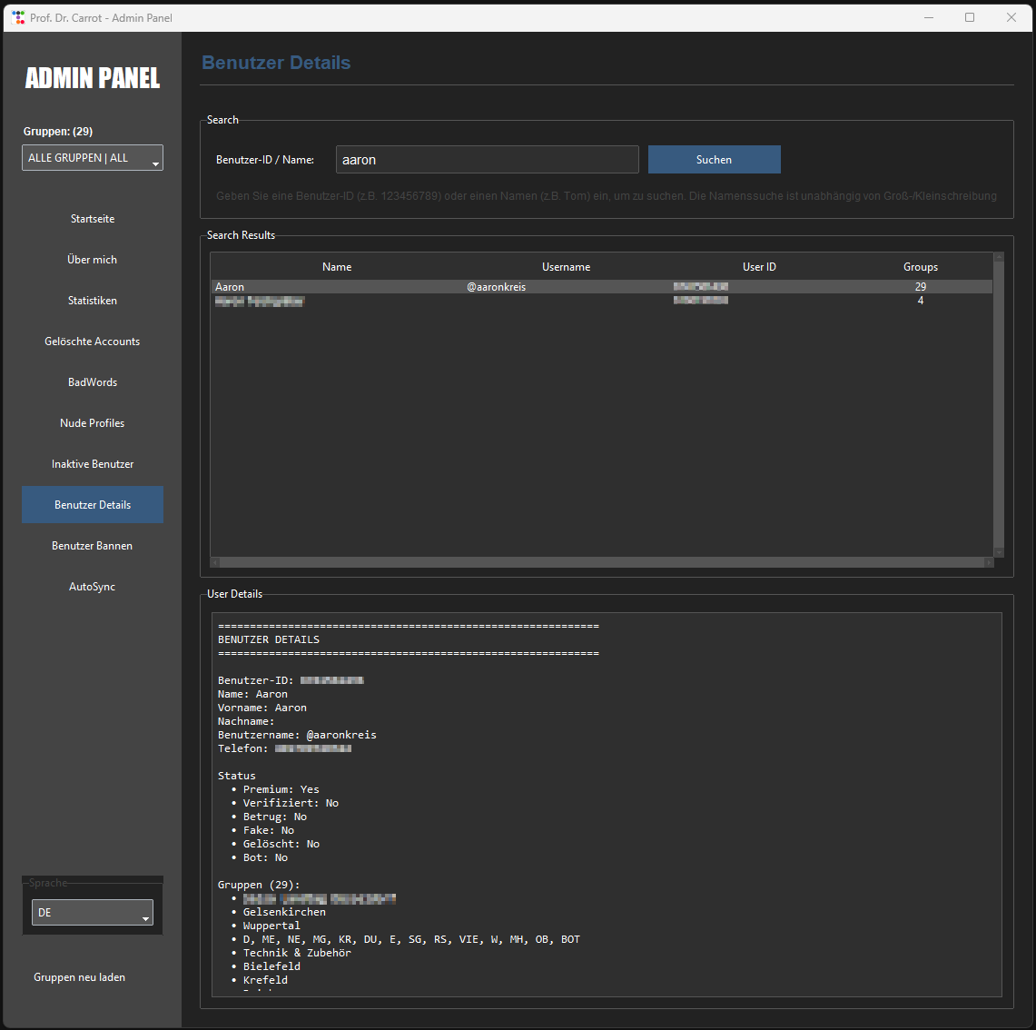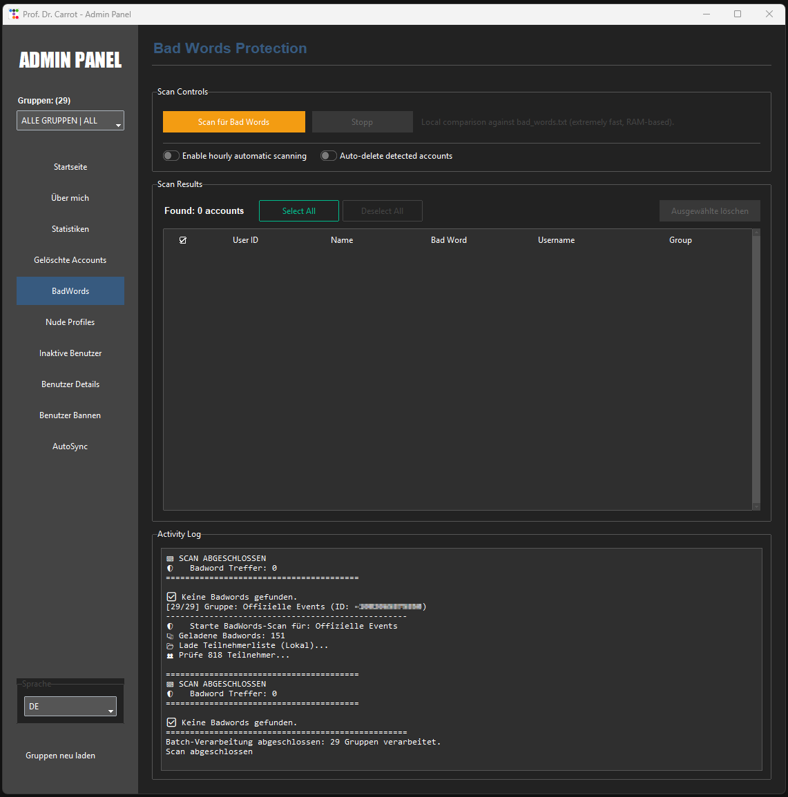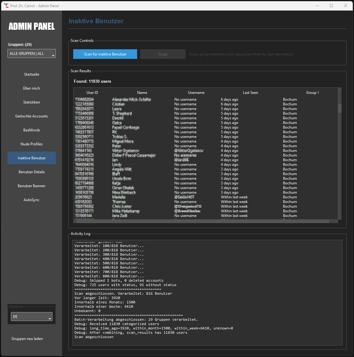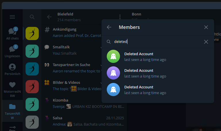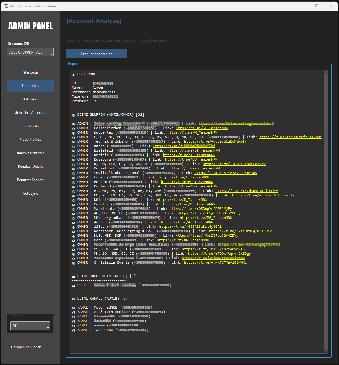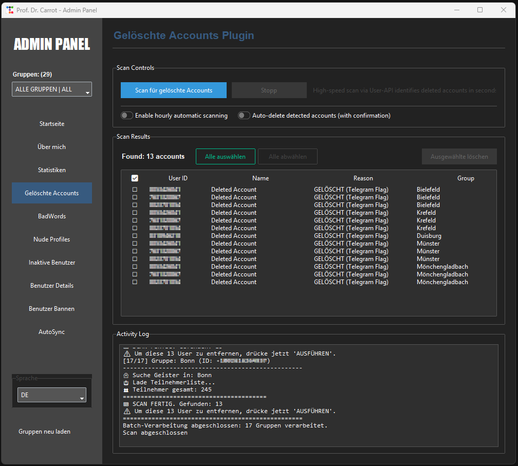 In Telegram Gruppen sammeln sich mit der Zeit Profile an deren Besitzer ihre Accounts vollständig gelöscht haben und die nur noch als leere Hülle in der Mitgliederliste verbleiben. Dieses Modul dient der Datenbank Hygiene indem es diese Gelöschten Konten über die API identifiziert und in einer übersichtlichen Tabelle auflistet anstatt sie als Geister zu bezeichnen. Anstatt mühsam durch Mitgliederlisten zu scrollen ermöglicht das Tool eine effiziente Bereinigung dieser Altlasten per Mausklick über alle verbundenen Gruppen hinweg wodurch die Mitgliederlisten sauber und aktuell gehalten werden.