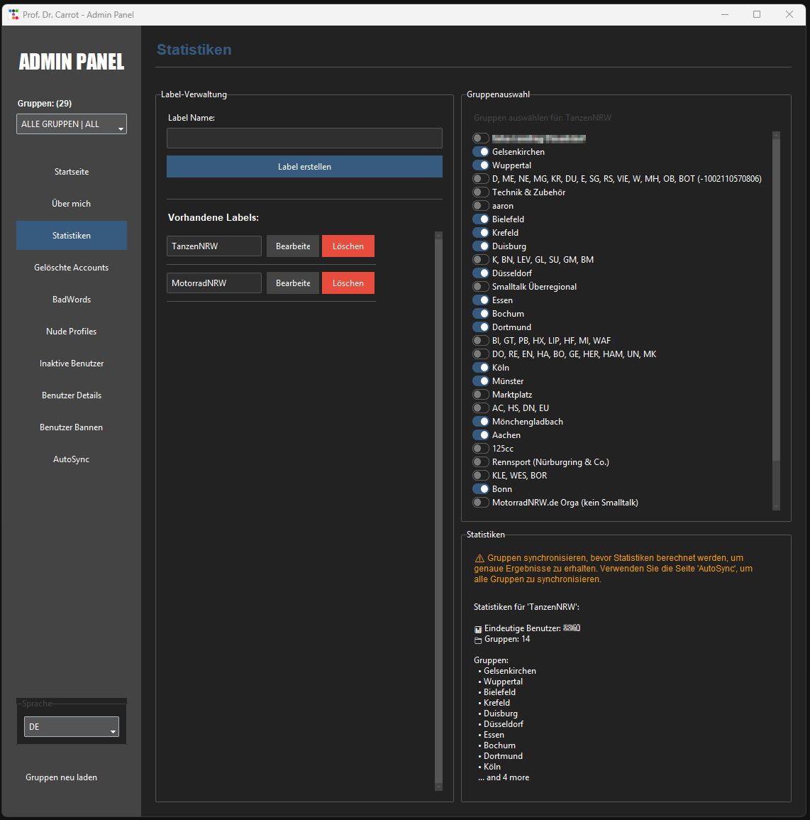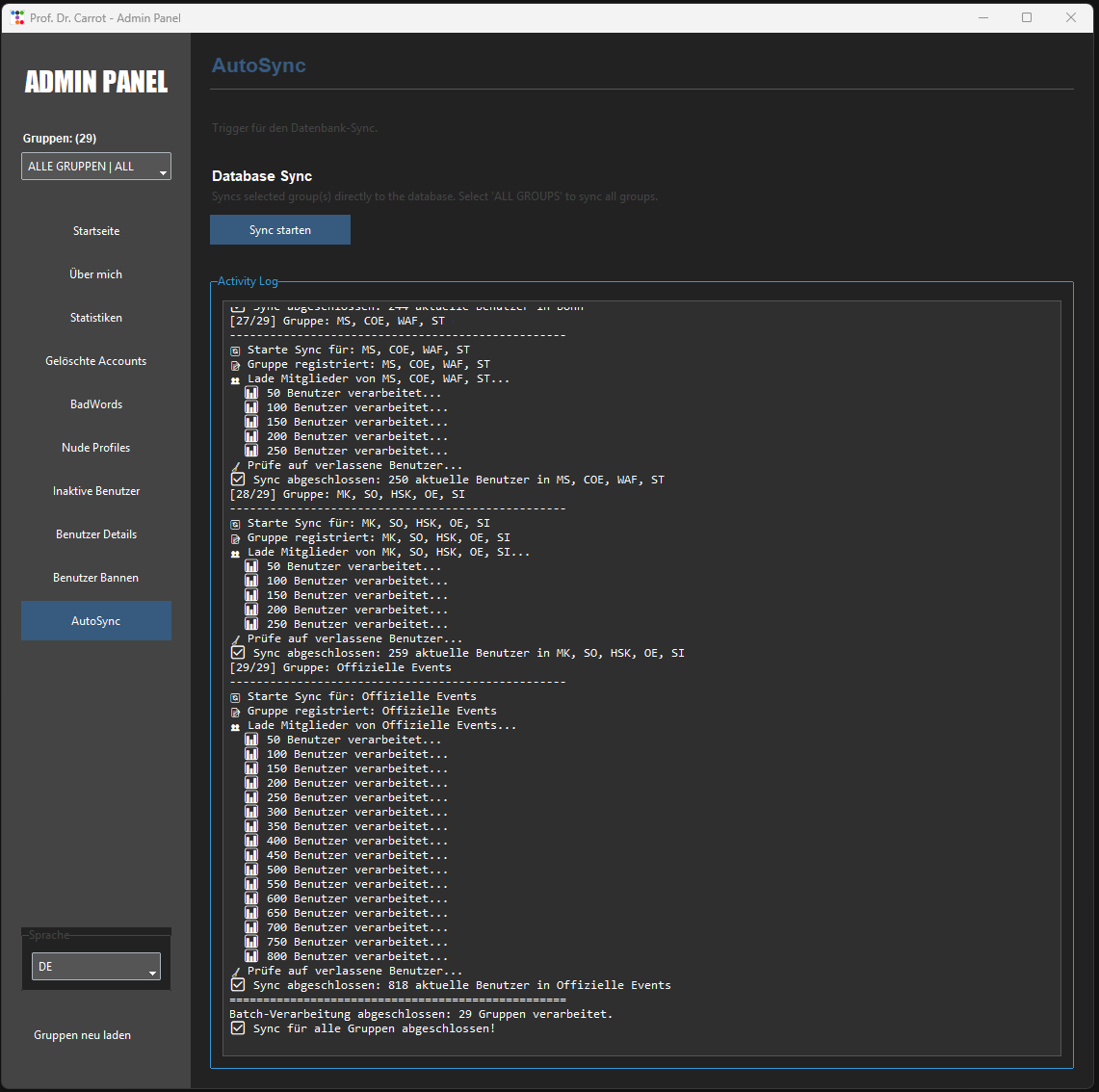 Damit sämtliche Analysewerkzeuge und Statistiken präzise Ergebnisse liefern ist ein absolut aktueller Datenbestand unerlässlich weshalb das AutoSync Modul als technisches Fundament der gesamten Anwendung fungiert. Da sich Mitgliederlisten in einem aktiven Netzwerk durch ständige Beitritte und Austritte dynamisch verändern gleicht diese Funktion die lokale temporäre Datenbank mit den Live Daten der Telegram Server ab. Im Prozessprotokoll lässt sich detailliert beobachten wie das Tool systematisch alle 29 Gruppen durchläuft und die Mitgliederlisten in effizienten Paketen herunterlädt um die API Limits von Telegram zu respektieren und Überlastungen zu vermeiden.