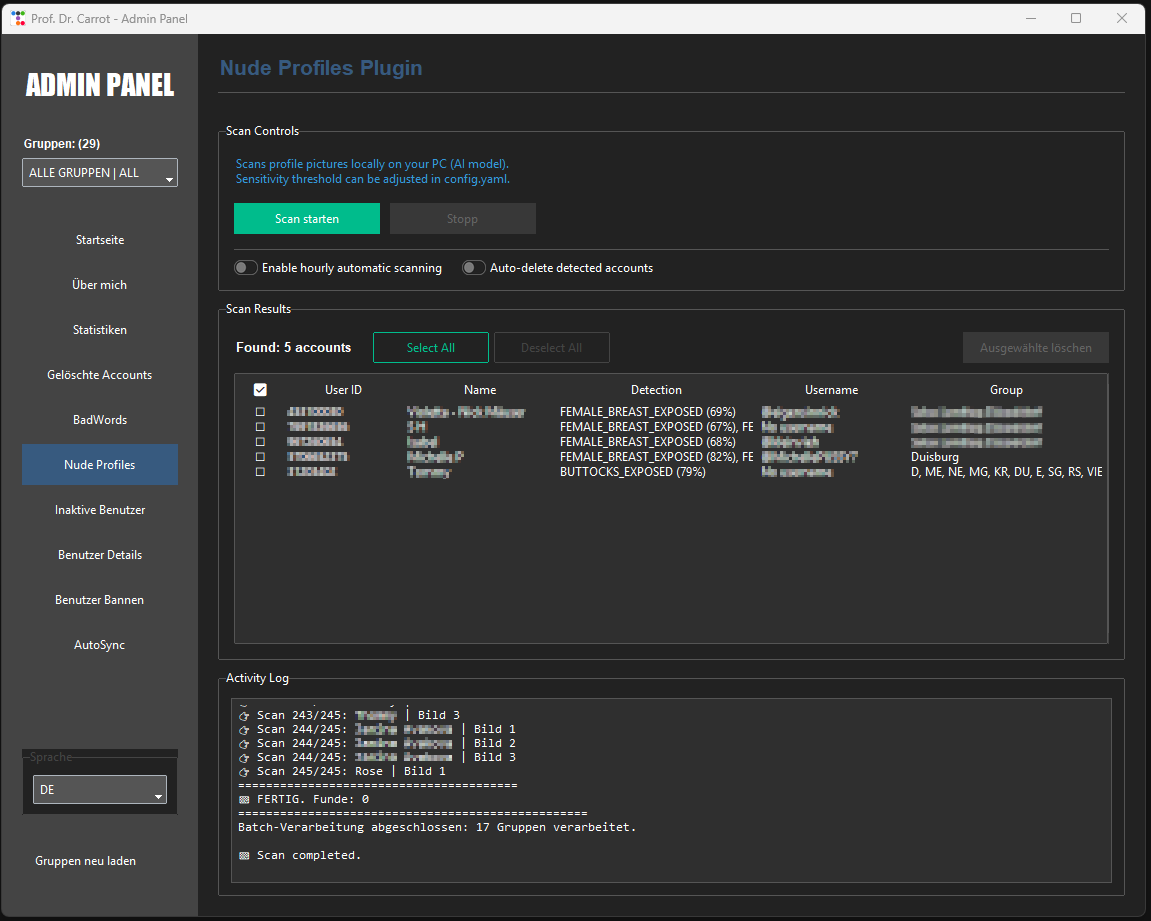 Deshalb integriert dieses Modul eine lokale KI Bilderkennung die spezifische Merkmale von Nacktheit klassifiziert und mit einem Wahrscheinlichkeitswert versieht um solche Profile sicher zu identifizieren. Dies ermöglicht dem Administrator eine präzise Säuberung der Gruppen von jugendgefährdenden Inhalten wobei durch die lokale Verarbeitung sichergestellt wird dass keine Bilder zur Analyse an fremde Server gesendet werden.