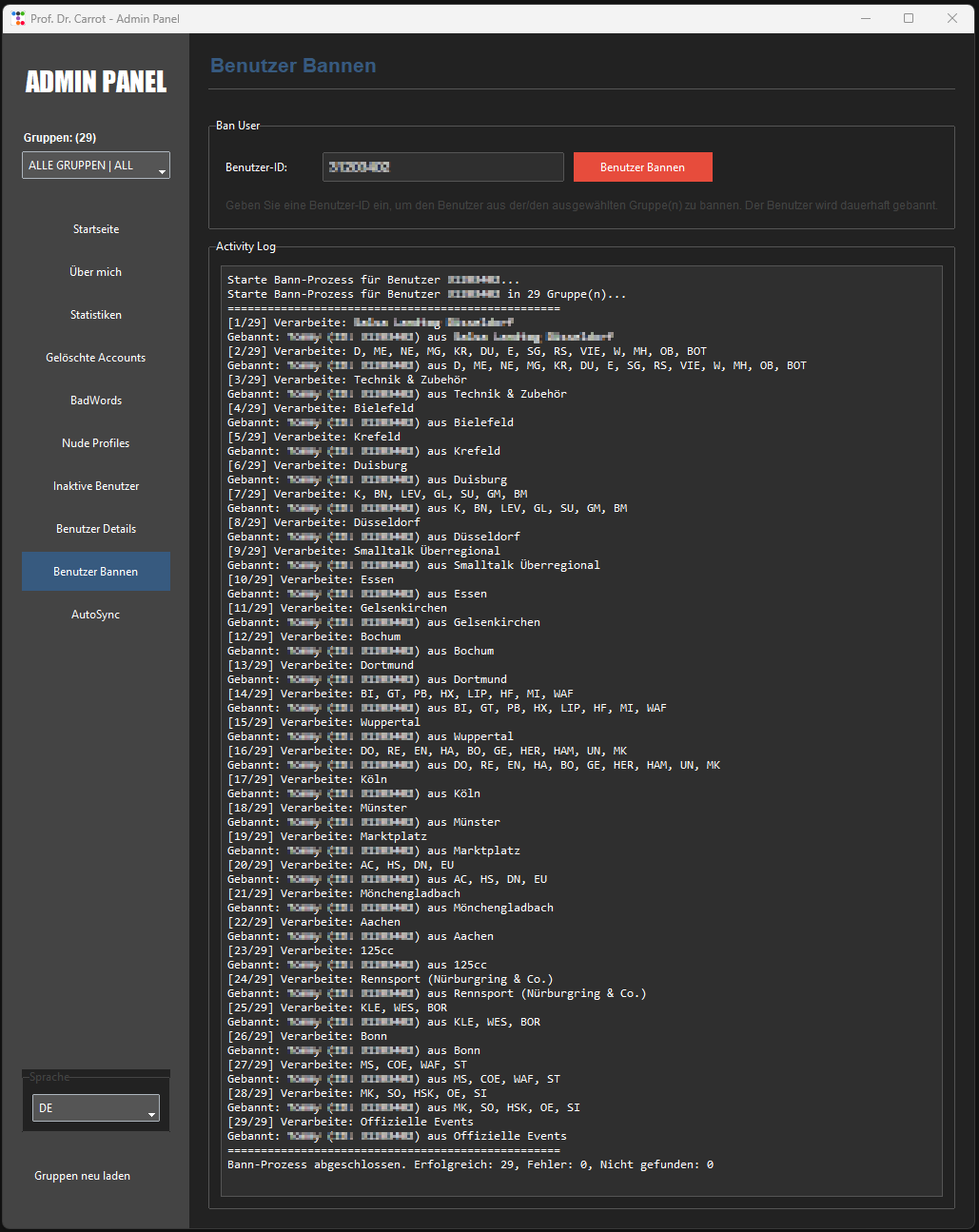 Wenn ein Spammer oder Troll in einer Gruppe auffällt ist er meist auch in anderen Gruppen des Netzwerks eine Gefahr die schnell und konsequent neutralisiert werden muss. Die Funktion nutzt die zuvor ermittelte ID um den Nutzer sequenziell aus allen 29 verbundenen Gruppen zu entfernen ohne dass der Admin jede Gruppe einzeln öffnen und bearbeiten muss. Das System arbeitet die Liste im Hintergrund ab und dokumentiert jeden Bannvorgang im Protokoll was den administrativen Aufwand massiv reduziert und die Sicherheit im gesamten Netzwerk sofort wiederherstellt.
