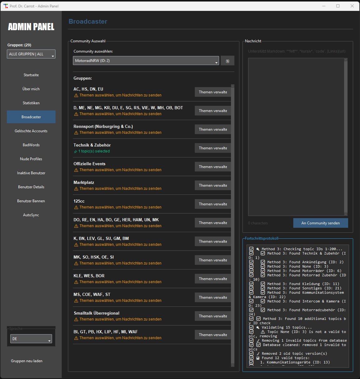 Um wichtige Informationen effizient in einem dezentralen Netzwerk zu verteilen, ermöglicht der Broadcaster das zentrale Verfassen und simultane Versenden von Nachrichten an alle Gruppen einer gewählten Community (z. B. „Motorrad“ oder „Tanz“). Das Modul unterscheidet dabei intelligent zwischen klassischen Gruppen und modernen Telegram-Foren: Es erkennt automatisch vorhandene Foren-Themen (Topics), validiert deren Aktualität und erlaubt dem Administrator, zielgenau festzulegen, in welchem Unterbereich (Topic) die Nachricht erscheinen soll.