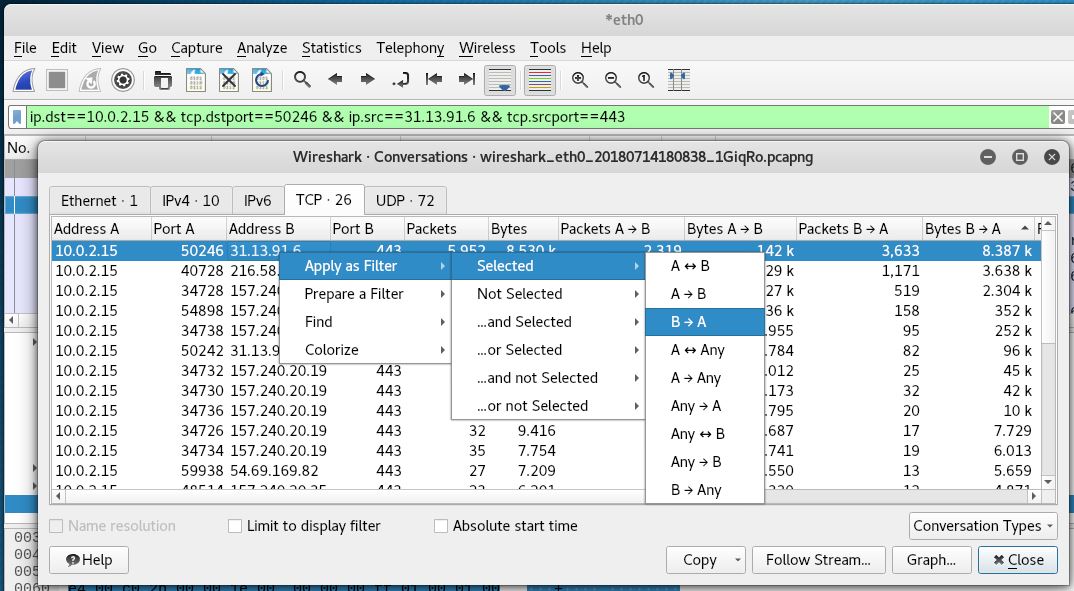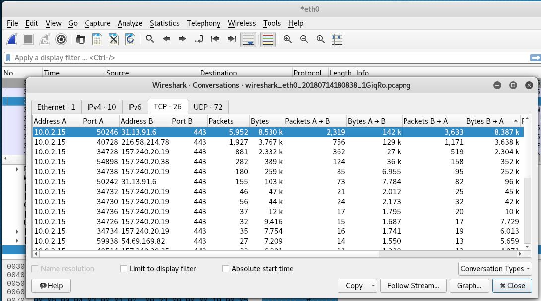 In diesem Bespiel habe ich im Hintergrund einen Film gestreamt. Da bei einem Stream der Traffic hauptsächlich vom Server (B) zum Client (A) fließt, habe ich die Sortierung nach (Bytes B->A) vorgenommen. Durch die unten aufgeführte Filterung werden anschließend nur noch die Frames angezeigt, die zum ausgewähltem Traffic gehören.