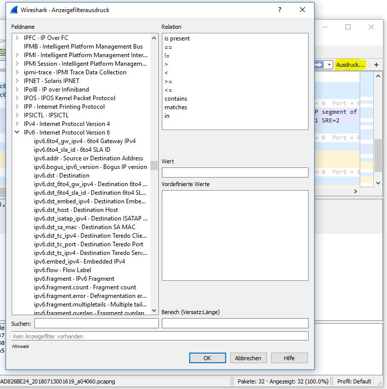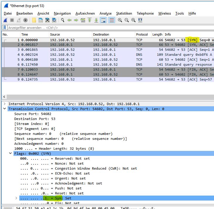Bei Auswahl der einzelnen Paket-Bestandteile z.B. ‘Source Port’ oder ’ Flags’ sieht man die entsprechende Größe in Bytes. Bei UDP liegt die Gesamtlänge des Frames by 8 Bytes statt 32 Bytes.