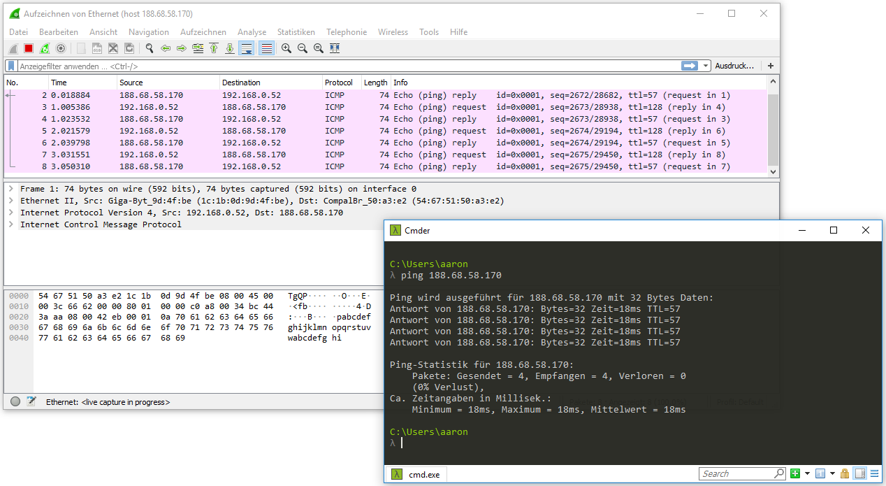 rot: Liste aller Frames grün: Wireshark Zusammenfassung (kein Bestandteil des Frames) orange: Frameheader lila: IPV4 Protokoll Informationen blau: ICMP Protokoll Informationen