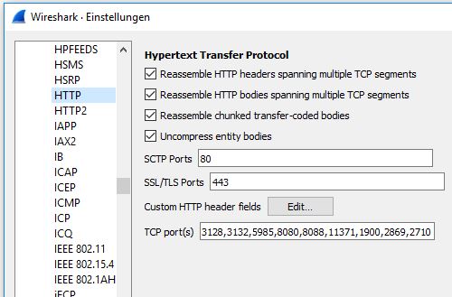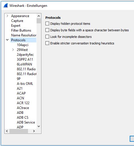 Unterstützte Protokolle Die Liste aller von Wireshark unterstützten Protokolle sind unter ‘Bearbeiten -> Einstellungen -> Protocols’ zu finden: