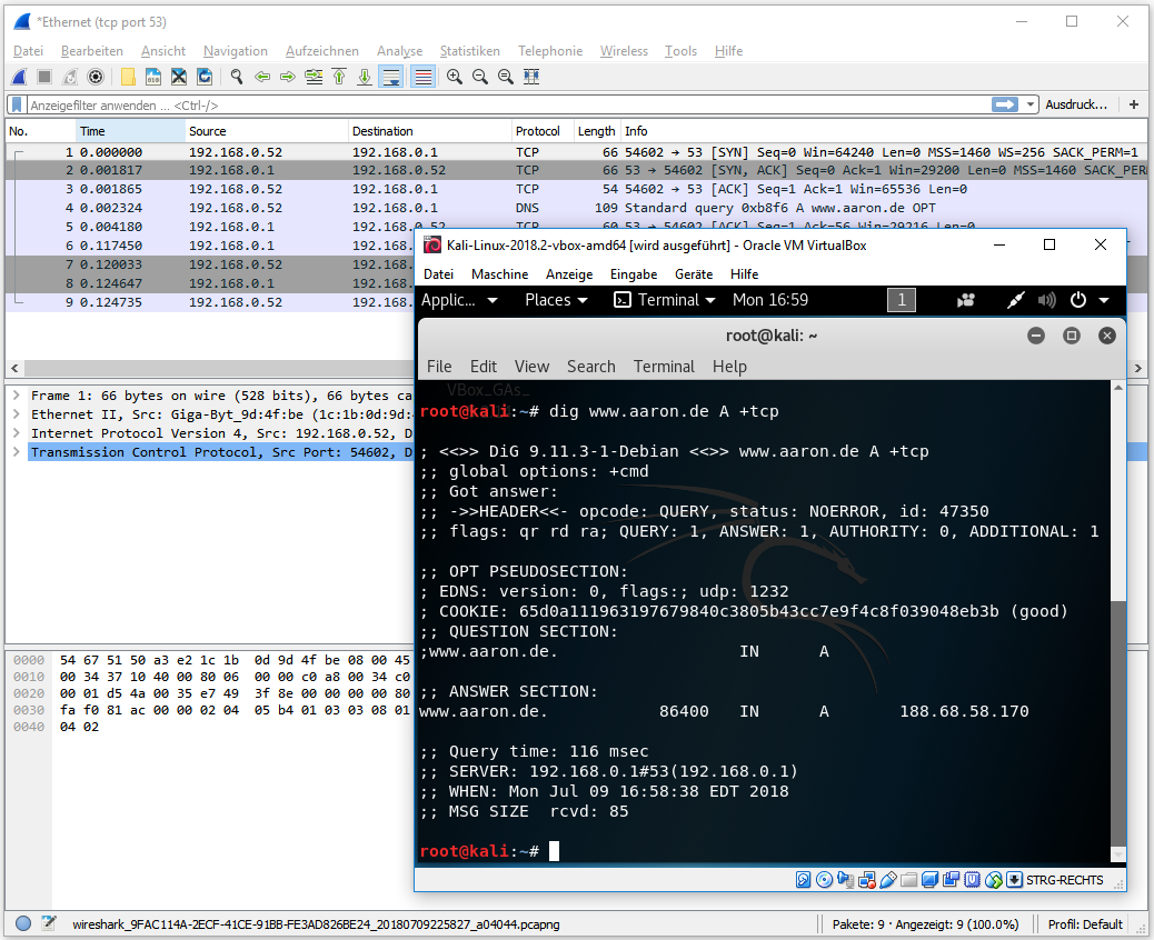 TCP Traffic Erzeugung via ‘dig www.aaron.de A +tcp’ . Beim Aufruf einer Webseite kann es passieren, dass der Traffic seitens wireshark nicht in der richtigen Reihenfolge angezeigt wird.