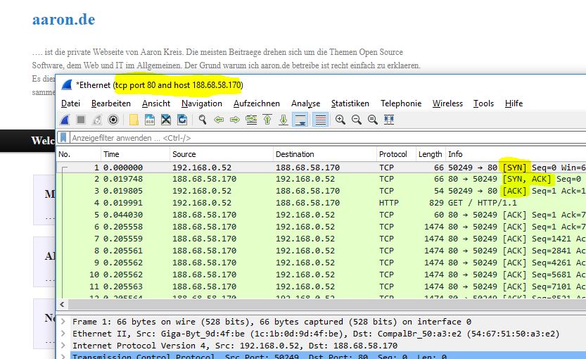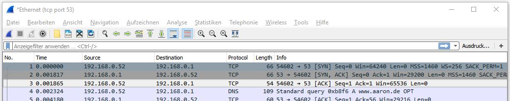TCP Traffic Erzeugung via ‘dig www.aaron.de A +tcp’ . Beim Aufruf einer Webseite kann es passieren, dass der Traffic seitens wireshark nicht in der richtigen Reihenfolge angezeigt wird.