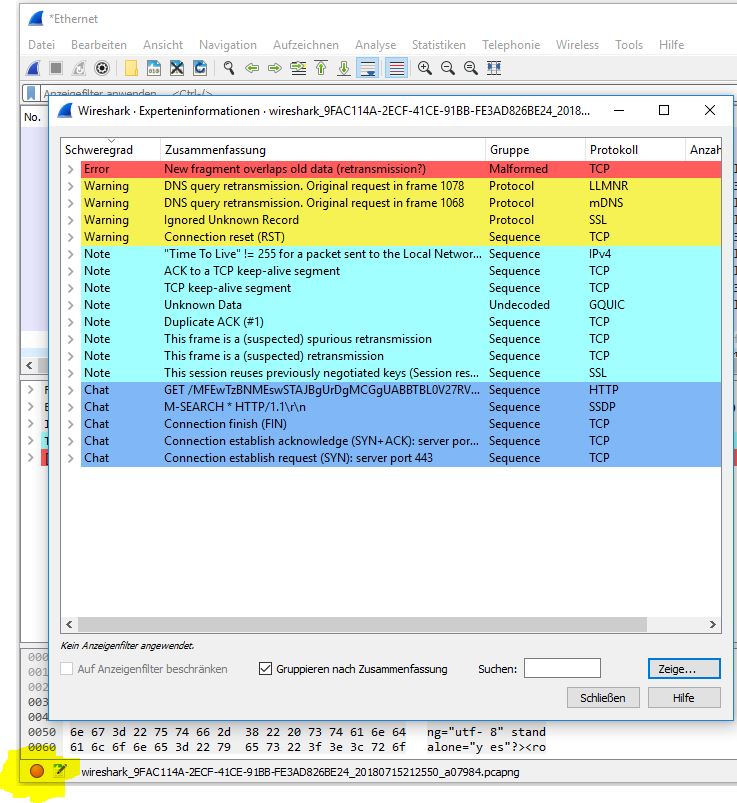 Experteninformationen Diese Anzeige zeigt Auffälligkeiten innerhalb der Datenübertragung und kann durch Auswahl des Kreises (unten links) angezeigt werden. Die Farbe des Kreises richtet sich nach dem Schweregrad.