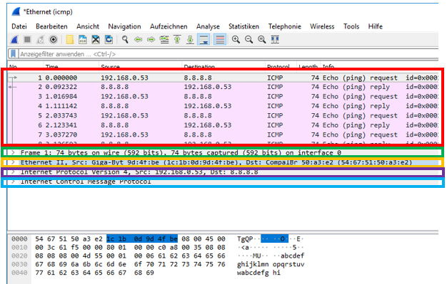 rot: Liste aller Frames grün: Wireshark Zusammenfassung (kein Bestandteil des Frames) orange: Frameheader lila: IPV4 Protokoll Informationen blau: ICMP Protokoll Informationen